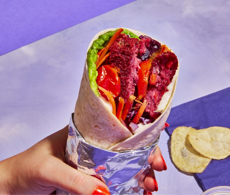 Build the wrap with gem lettuce, sliced Strong Roots Bean & Beet Burger, naked slaw, sun-blushed tomatoes and fold
