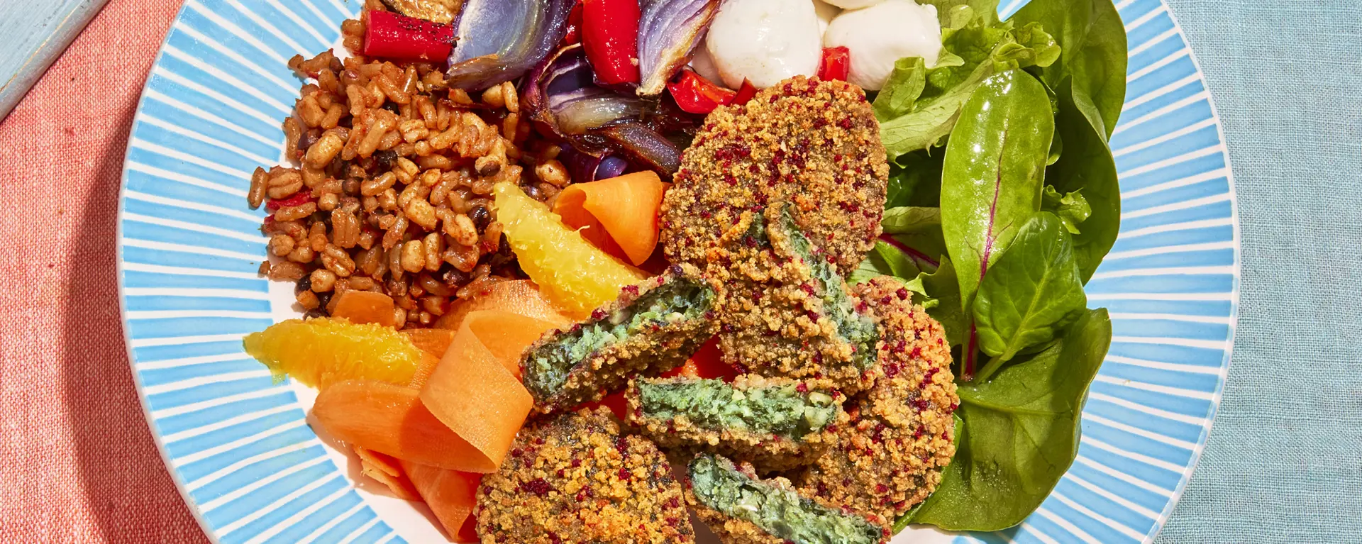 - Plate salad leaves, carrot and orange salad, and warmed Spanish grains.