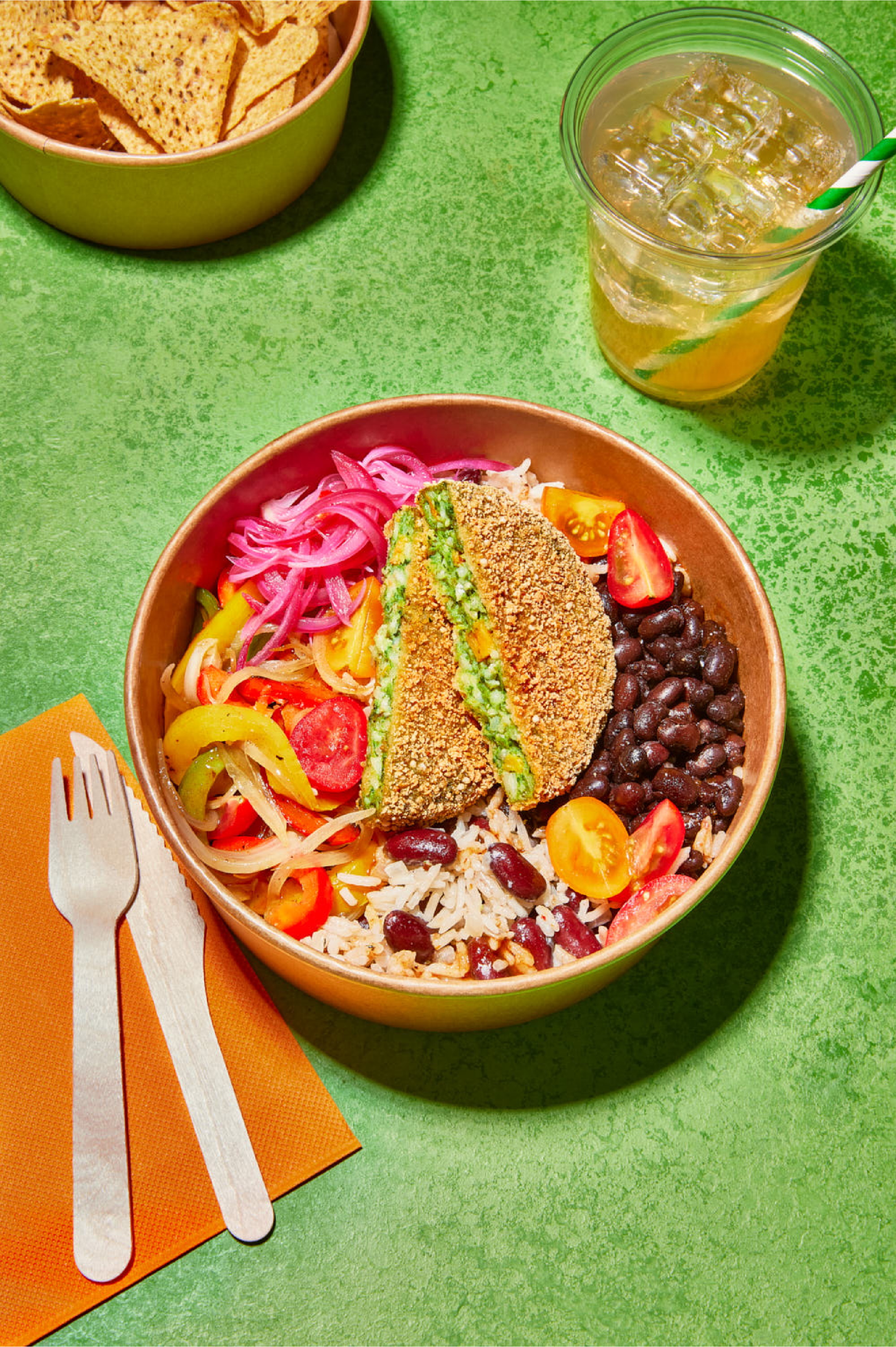 Reheat rice and peas, black beans and sauté peppers and onions separately until piping hot