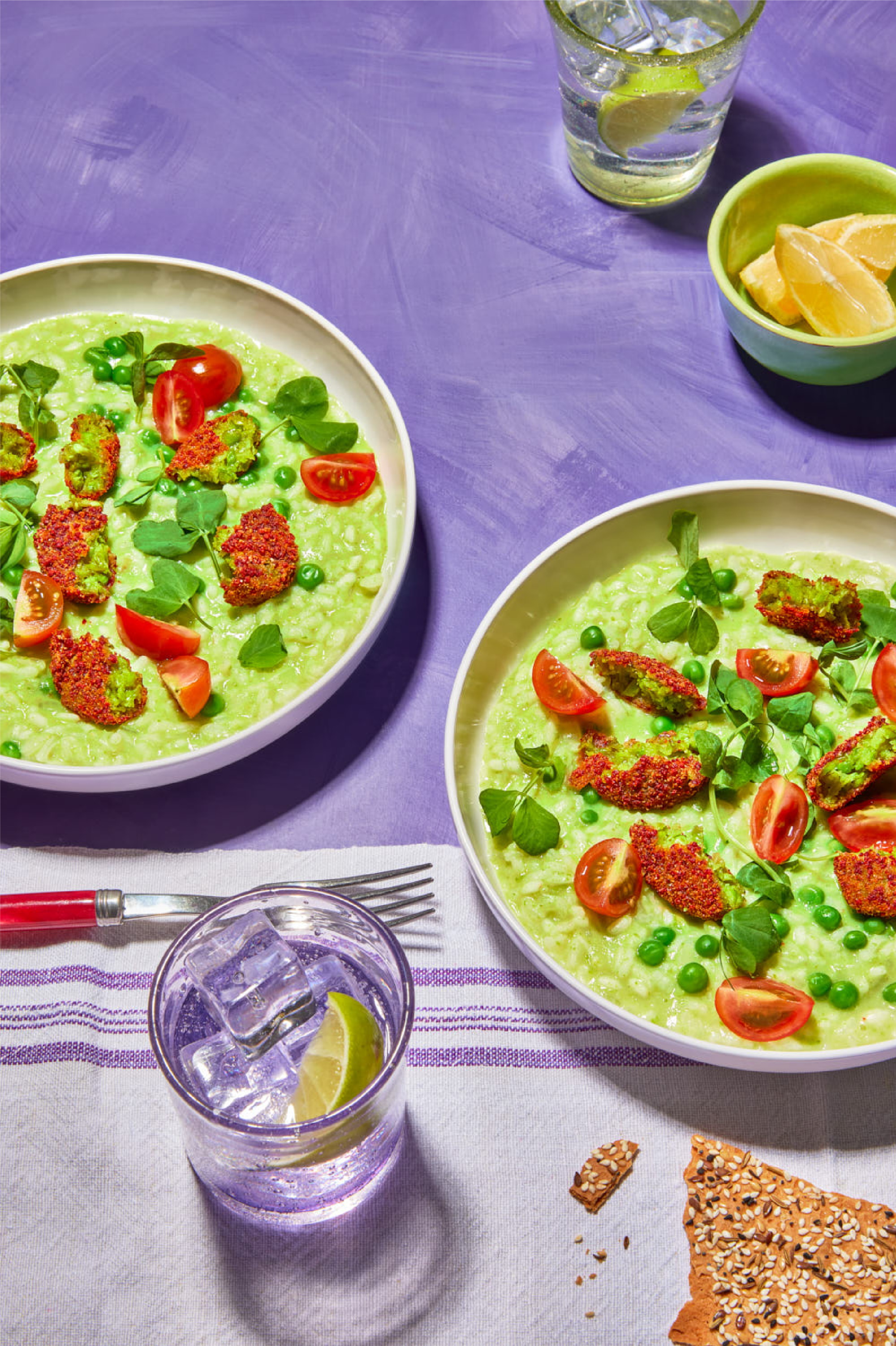 Place risotto in the bottom of the bowl and top with broken up pea and lemon bites, pea shoots, cherry tomatoes