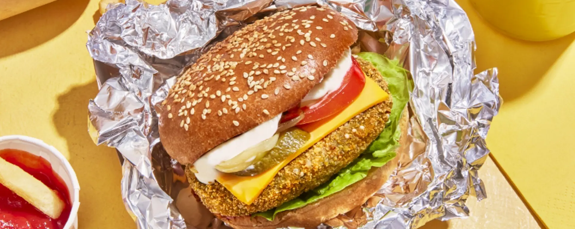 - Build burger with washed and cut gem lettuce, Pumpkin & Spinach Burger and an American cheese slice, sliced tomato, sliced dill pickle and fried onions